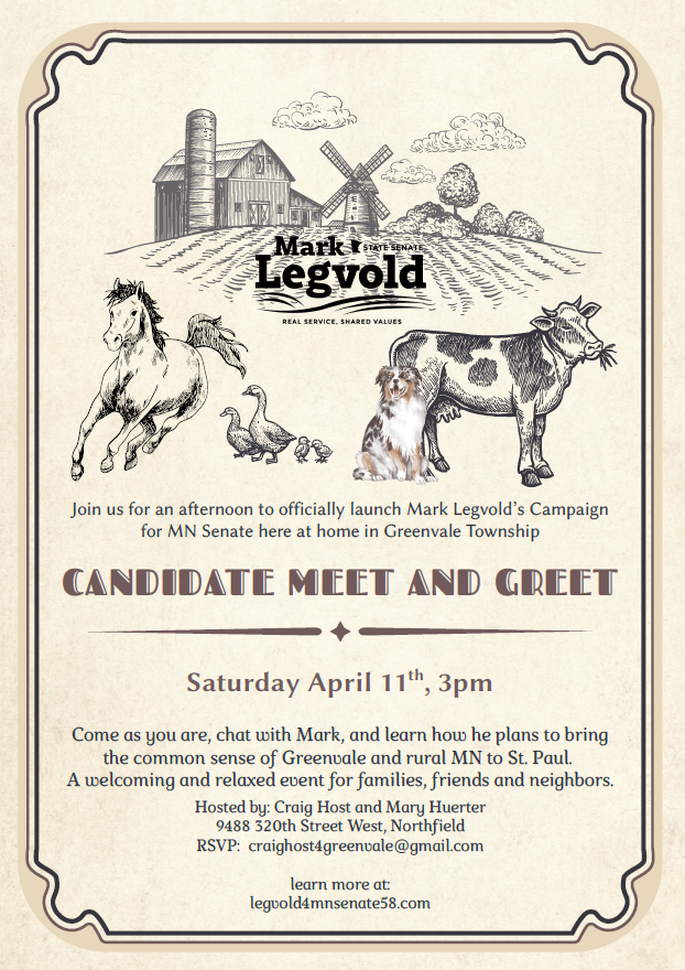 Hosted by: Craig Host and Mary Huerter, 9488 320th St. West, Northfield. RSVP: craighost4greenvale@gmail.com.
